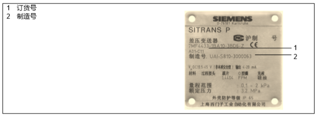 按照用戶合同上的技術要求,西門子壓力變送器的組件有不同的配置。 帶有合同編號的銘牌可在表體的側面找到。你可以根據具體的代碼和技術規格說明,確定選項的構成細節和允許的測量范圍(即封裝的傳感器元件的物理特性)。